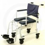 Mobile shower chair designed for use in the shower and also fits over most standard toilet bowls.